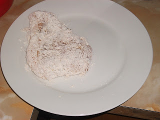 2. Put the whisked egg in a bowl separate from everything else. So you are now ready to begin as in the picture below pork chops, egg & crumb mix. Also put your oven dish in the oven with oil in it, this will help so that the pork chops don't get stuck to the dish.
